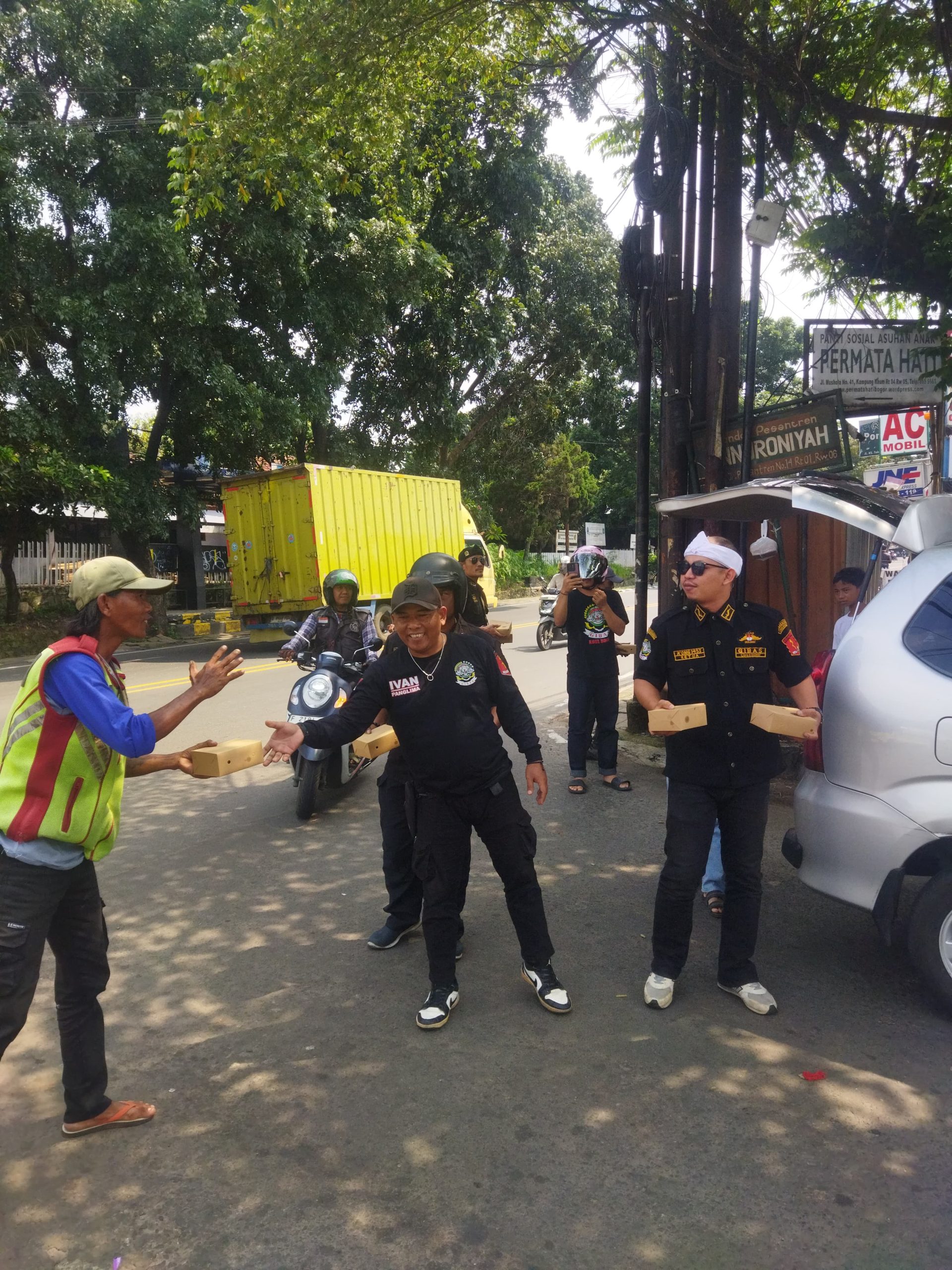 – Tampak berbeda hari Jum,at ini di jalan raya Bogor sampai ke jalan pandu raya bogor utara, gerombolan berseragam hitam mendatangi mayarakat di pinggiran jalan dari berbagai profesi seperti ojol, tukang parkir, para pemulung dan lainnya, tiada lain yang mereka lakukan dalam rangka giat sosial untuk membagikan makanan sebanyak 150 (seratus lima puluh ) dus.